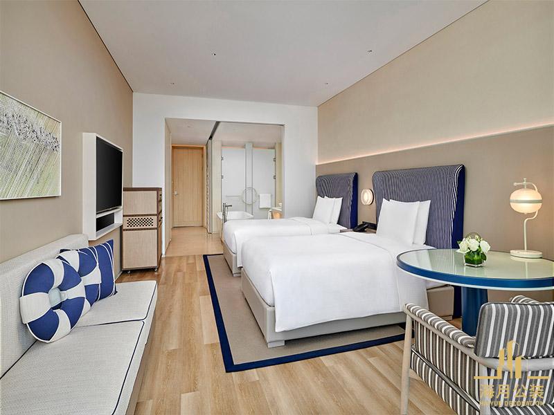 客房区域是宾客体验的核心。布局上力求合理且功能齐全,既保证了休憩空间的静谧,又兼顾了日常活动的便利性。墙面采用浅木色或柔和的米色,浅木色的自然纹理仿佛将苏州的林木景致引入室内,柔和的米色则如暖阳般营造出温馨氛围。搭配精致的装饰画,或展现苏州的市井烟火,或描绘苏州的人文风貌,为客房提升了艺术氛围,让宾客在住宿之余,也能感受当地文化的浸润。床品选用洁白整洁的面料,触感细腻亲肤,为宾客带来优质的睡眠体验。床头设计颇具巧思,部分融入蓝白条纹元素,蓝白相间的色彩如同成都天空与河流的交融,为空间注入一丝灵动活力,打破了浅色系的单调感。