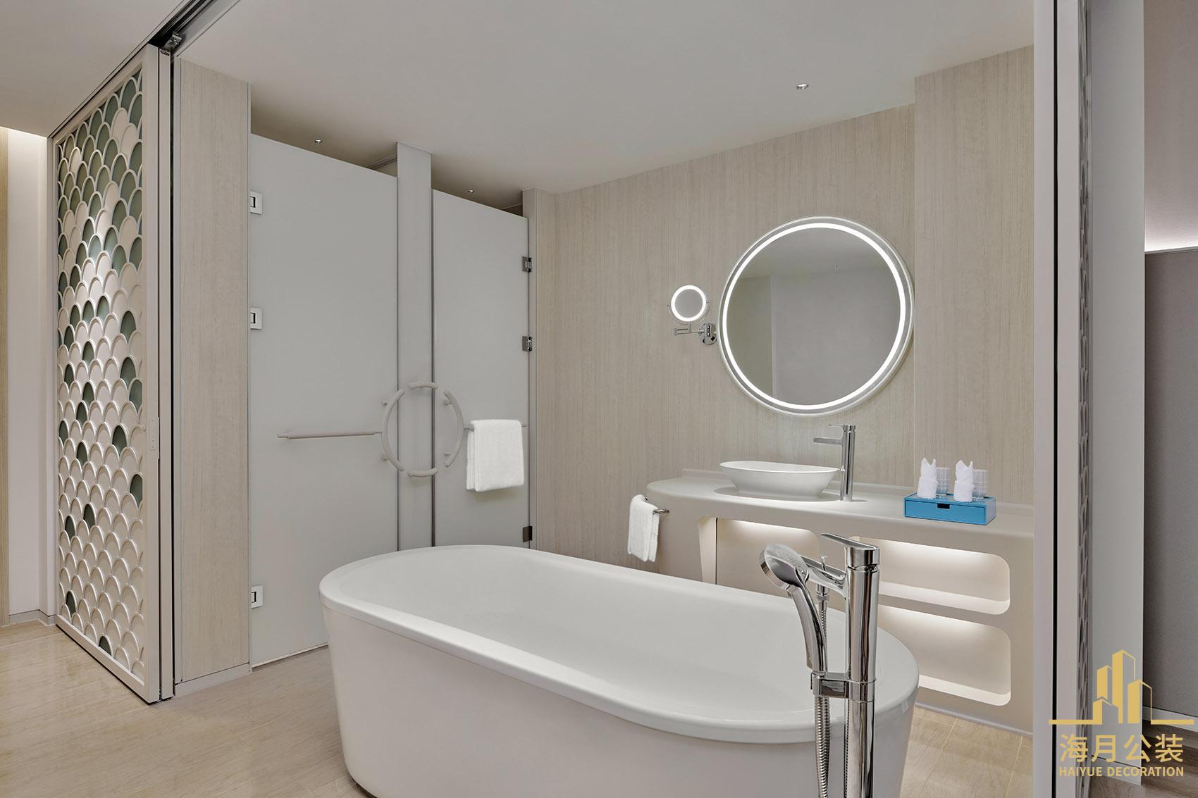 浴室区域同样不容忽视,是体现酒店品质的关键细节。圆形镜子边缘带有柔和的灯光,既方便宾客整理仪容,又在灯光映照下增添了空间的温馨感。洁白的浴缸与洗手台,材质光洁,易于清洁,展现出简约大气的风格。带有纹理的隔断,不仅起到了功能分区的作用,其独特的纹理设计也为浴室增添了美观度,让浴室在保证实用性的同时,不失雅致格调。