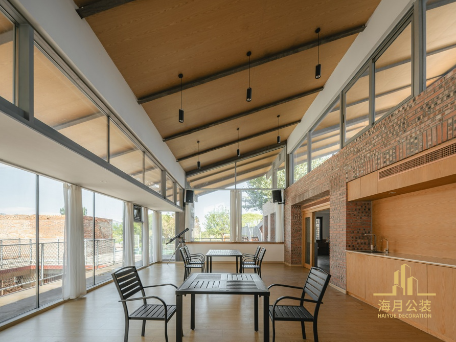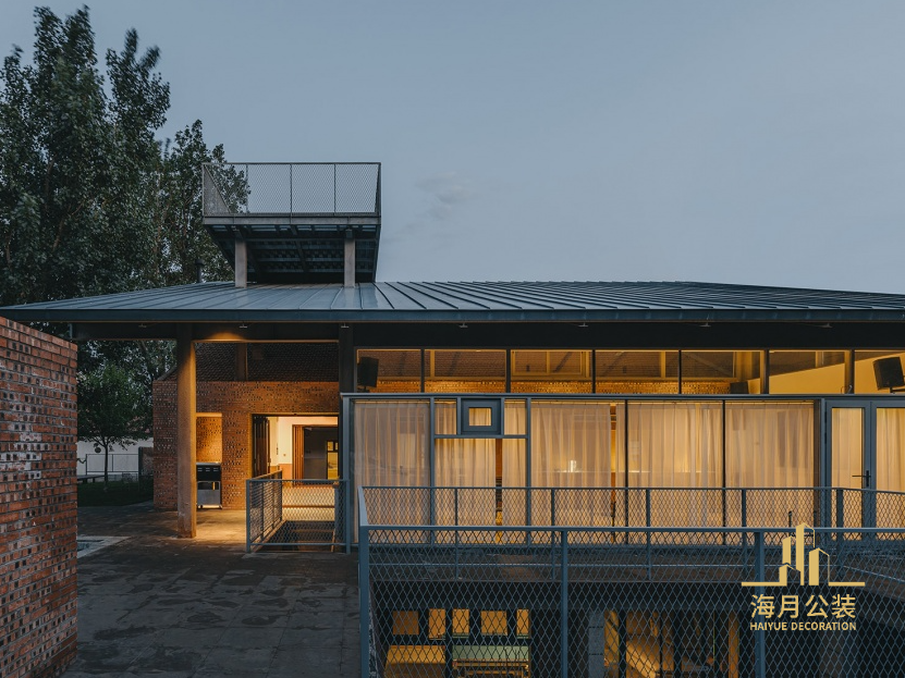从下沉庭院拾级而上,地势回到场地本身的标高后,带来的是远处开阔的视野,山峦、树梢、田野连成一片。收回视线,是院子里石板平台、茸茸草坪和柔软水面。原有的两栋房屋质量尚好,因而得以顺利保留。北侧房屋的屋顶之上额外架一层巨大的单侧钢质屋顶,在远处村庄的边缘也能一眼瞧见,乡野民居的平淡通过夸张体量得以平衡。大屋顶下通过空间设计我们置入玻璃盒子作为多功能厅,使钢质屋顶轻盈地漂浮在房子之上。再给原房屋复合公共休闲与交通功能,红砖堆叠中回归村土寻常。