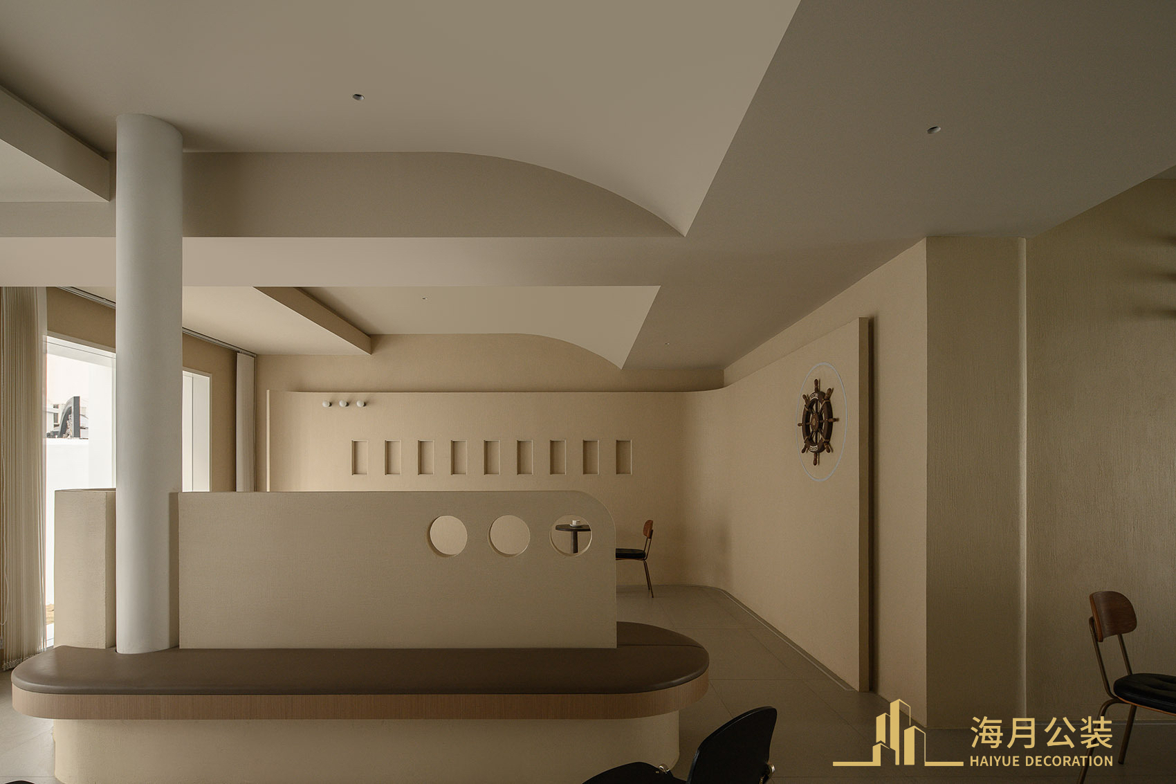 近年来,为了减缓捕捞对生态环境造成的破坏,太湖开始实行“十年禁捕”计划。面对十年禁渔的太湖,曾经以捕鱼为生的渔民纷纷驾船回港,停靠在港边的渔船连成一片,在安宁中又显露出一种繁盛的状态。我们的民宿项目便坐落在太湖边,这片渔船之中。项目原建筑是太湖边的一所民房,房东以前便是靠打鱼为生的渔民。我们期望在新的项目改造之中,能够将他曾经“沧波万顷即良田,一舸东西卧碧天”的美好记忆保留在建筑里,由此便展开了以“渔船回港”为核心的空间设计。原建筑为当地村民自建粉色欧式小洋楼,因乡村建设控制不能对建筑进行大改大建,只能对外立面进行限制性改造。我们采用“微创手术“的方式尽量用最小的介入方式,让建筑能够达到比较好的状态。首先是把所有罗马柱及欧式的符号拆除,换掉绿色瓦片,粉刷外立面,去掉边边角角,让建筑还原到最简单的状态。室内尽量扩大景观面我们再窗边设计了一个很小透气窗。增加每个阳台的包围感。通过小拆小改让建筑更新。轻盈的纸船漂浮在建筑的入口处,拉开了空间的序幕。此处是回港渔民暂时停泊的港湾。空间中随处可见渔民生活中的物件,打捞的贝壳、渔船的造型、水的表现形态……它们以元素的形式介入空间,以“渔船回港”为核心,将一楼空间打造成对外开放的停泊、休憩的咖啡厅,同时也可以作为民宿的公共区域。空间中加入“船”的元素 —— 建筑与室内的大面积留白。作为视觉的重心,咖啡吧以抽象的船只形象出现,停泊在空间中。梁柱是船只的桅杆,以卡座、靠板为船体。将社交功能与艺术美学带入空间设计中,保留了咖啡厅的商业化功能,同时在意象化的演绎中解构时间,将咖啡厅打造成漂泊于湖面的渔船,营造出渔民日常的生活氛围感。空间里承载着渔民过往的生活碎片,太湖水底的石子铺设在楼梯底部,为空间注入了另一重含义。简朴的陈设与光线交叠。通往上层的楼梯,以老旧与新式结合的形式呈现,保留了部分原建筑的造型,古旧的檩木、椽子露出时光流淌过的印记,与极具现代感的楼梯造型结合,塑造出视觉感官的新旧对话。