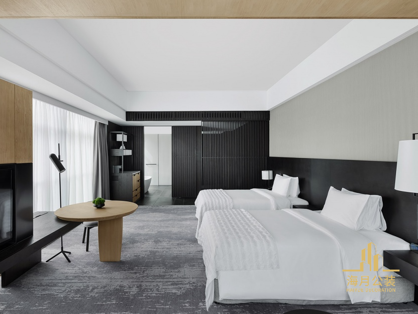 简洁的线条和清晰的体块构筑了客房空间。房间的装修设计通过简明的材料糅合当代设计和传统细节,辅以低饱和度的颜色,营造出宁静、舒适的氛围。