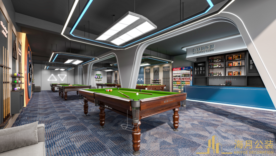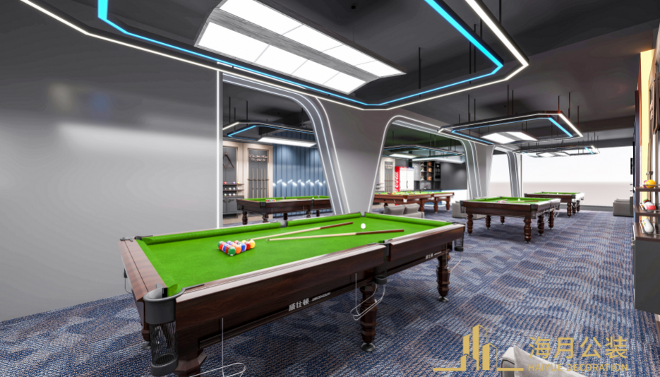 顶部灯具采用线性设计,光线均匀分布,既提供充足照明满足台球运动对光线清晰度的要求,又通过灯光的造型增强空间的现代感与科技感 。重点照明突出背景墙和台球桌,营造出主次分明的光影效果。