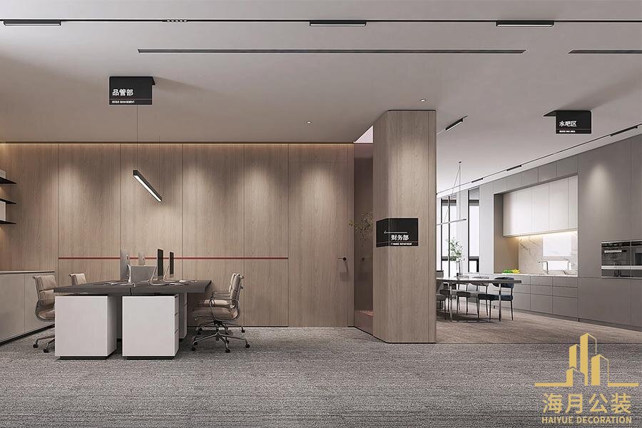 效服务属性,运意管理部的高频协作需求,到品管部与财务部的专注私密诉求,进行全维度拆解,确保设计与实际场景精准匹配。设计中握弃千篇一律的风格复制,以"功能优先,美学赋能"构沟通的同时,通过分层灯光设计避免视觉杂乱,营造专注氛围;品管部与财务部则以木饰面半封闭隔断界定独立区域,通透材质平衡专注度与空间呼吸感。专属规划的休闲区与水吧区,以大理石台面,社交型座椅构建温馨场景,既是员工放松角落,也是跨部门交流平台,让工作与生活自然过渡。